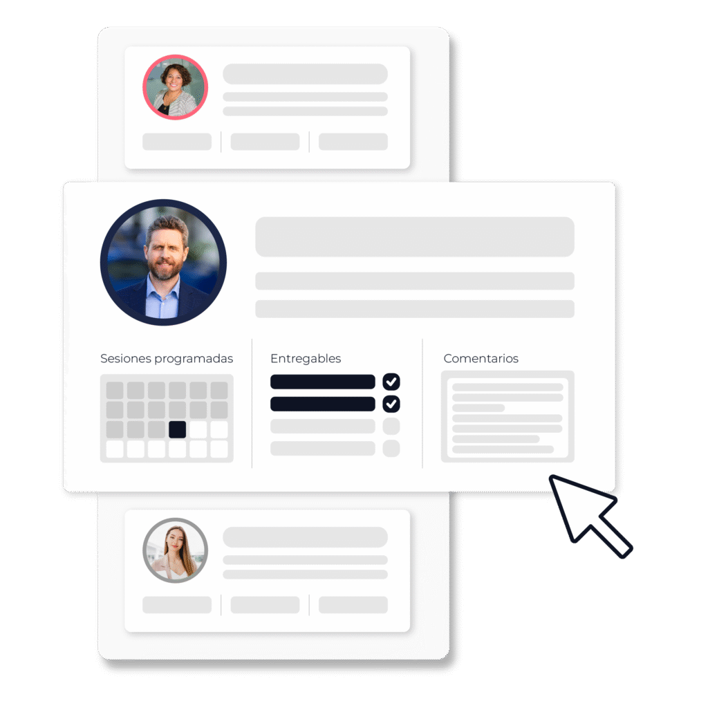 Accede a reportes de avance por participante, sesiones programadas, entregables y comentarios, todo desde un solo lugar y con trazabilidad total.